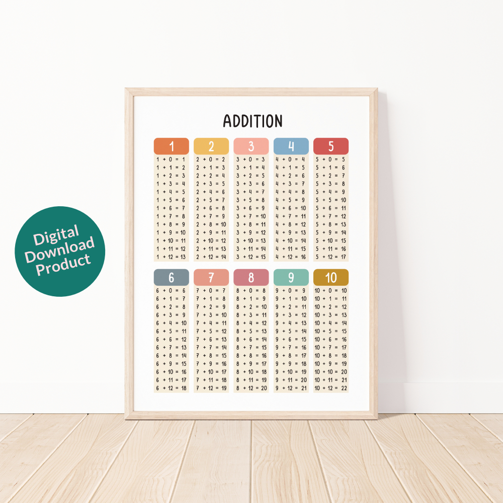 Beautifully designed printable math multiplication table educational poster in pastel rainbow. Created to help your child learn math more easily by adding a touch of colors for a more fun learning atmosphere.